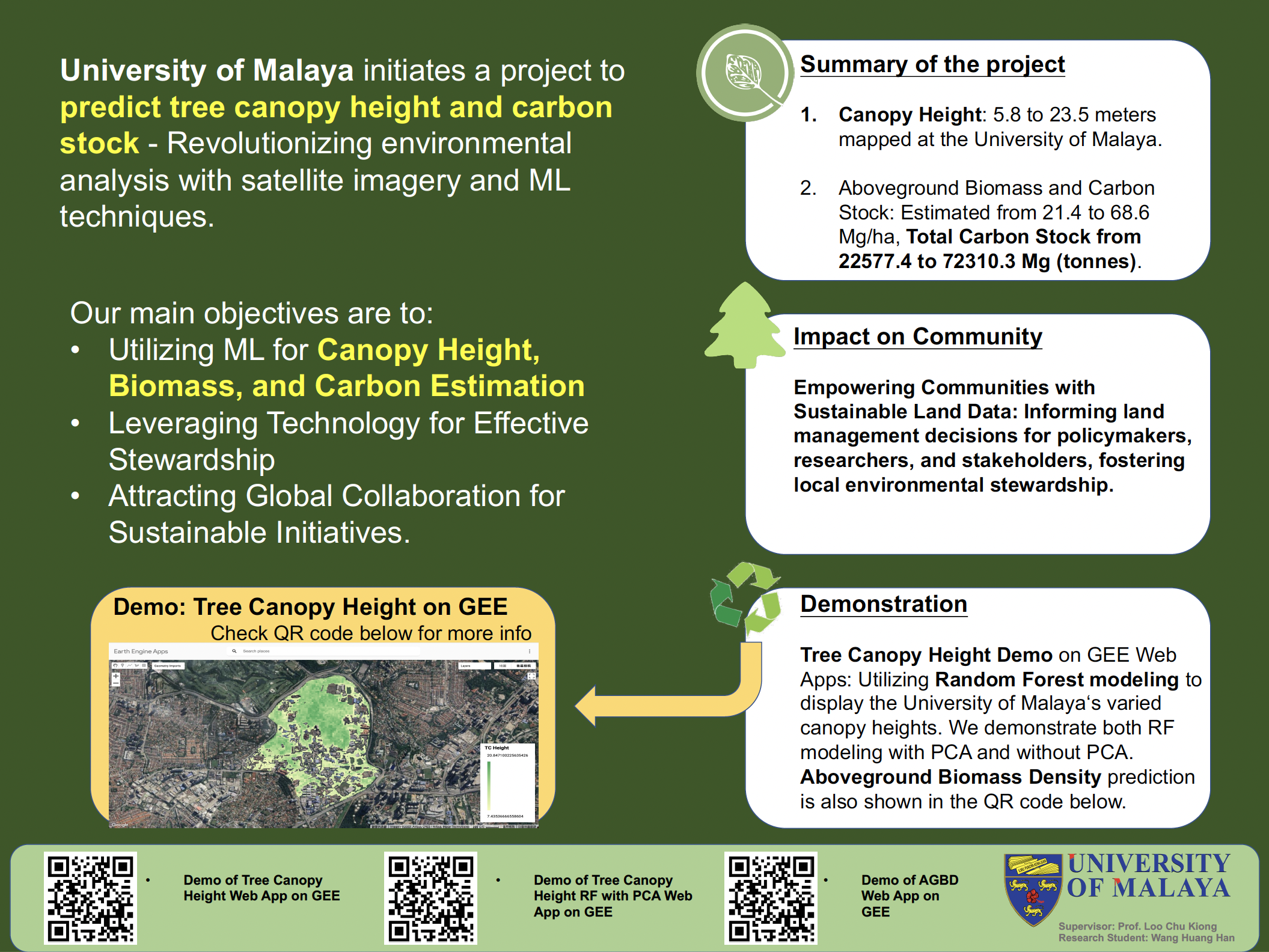 This project uses satellite imagery on Google Earth Engine (GEE) to predict canopy height and estimate carbon content in the University of Malaya (Kuala Lumpur, Malaysia) area.