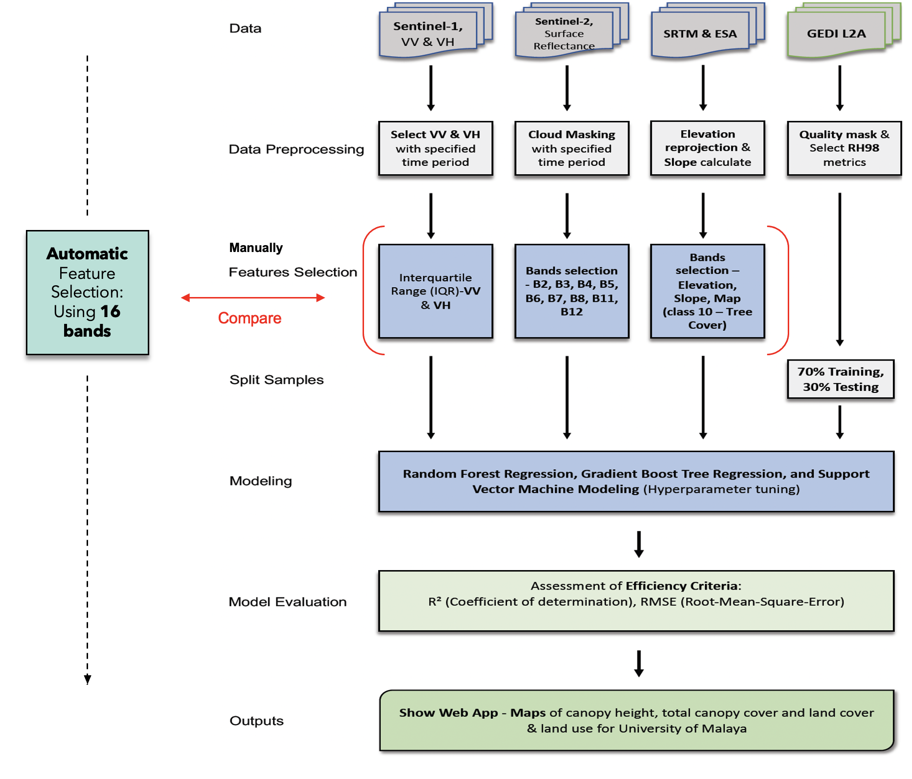 Important Note: This example code illustrates the process of conducting canopy height regression modeling utilizing the Random Forest model along with manual feature selection.
